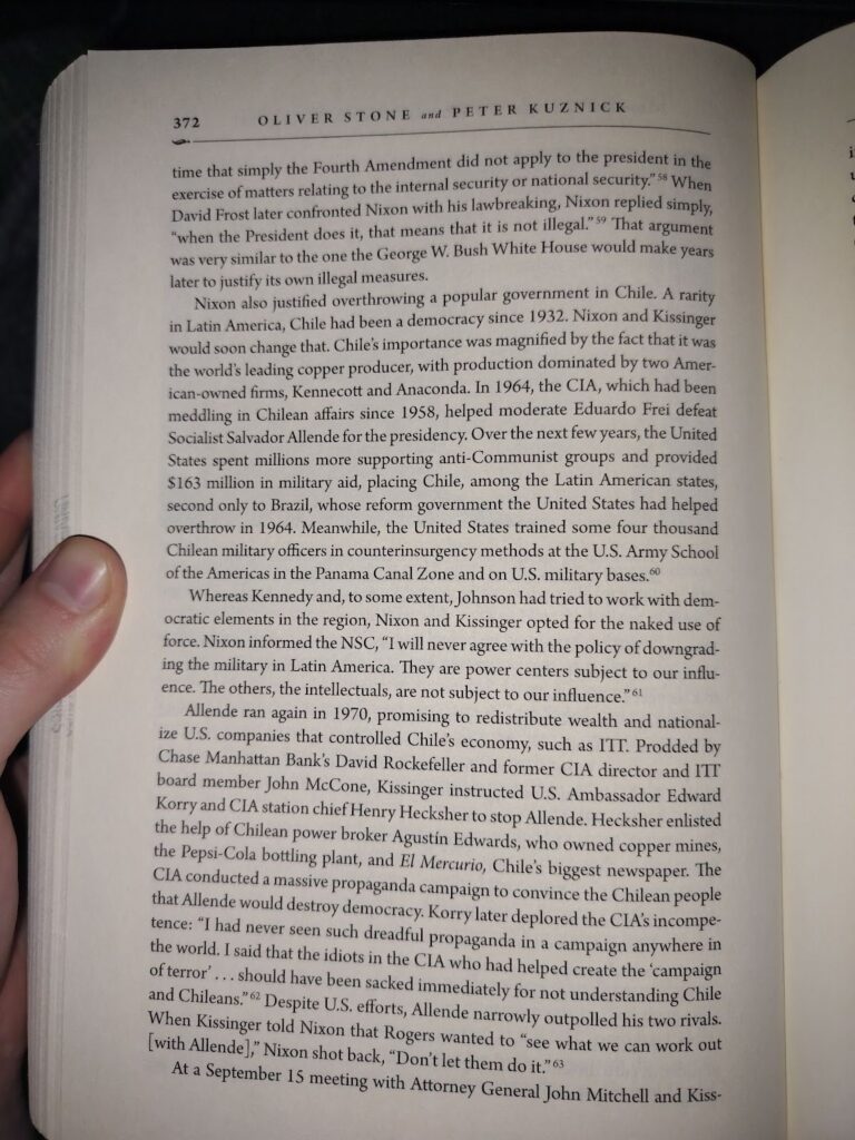 - Unhumans leaves out the CIA’s role in trying to prevent his election and then causing civil unrest (which Unhumans blames on Allende) and then ordering the coup (to be fair, Untold History leaves out the Communist party’s support of Allende in the election)